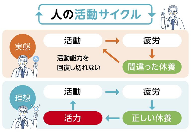 疲労回復には「休養」が必要ですが、「寝る・何もしないこと」が休養だと思っていませんか?もちろん睡眠や休息は大事ですが、それだけでは回復し切れず、次の日も疲労が残った状態からスタートとなると負のスパイラルに。活動のパフォーマンスを上げるには「活力」を生む休養が必要で、「活動→疲労→休養→活力」というサイクルを回していくのが理想的です。