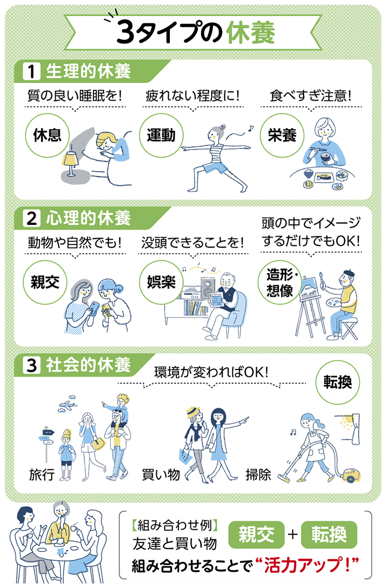 一日中ベッドの上でゴロゴロしているだけでは活力は湧きません。休養には「生理的」「心理的」「社会的」の3タイプがあり、活力が生まれる休養を積極的に取り入れることが重要です。