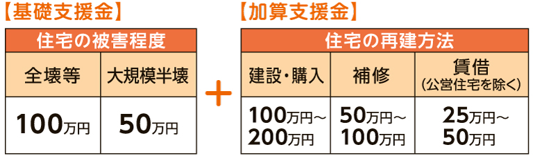 1市区町村で10世帯以上全壊の災害時、住宅が中規模半壊以上の場合に支給されます。住宅の壊れ具合と再建方法に応じた「基礎支援金」と「加算支援金」の2種類で、両方合わせて最大300万円の支給。(問い合わせ先:市区町村)