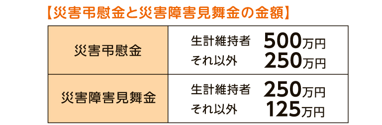 災害弔慰金:同生計の遺族に支給されます。災害関連死や、行方不明で3カ月を超え生死不明となった場合も対象になることも。(家族の申し立てが必要)