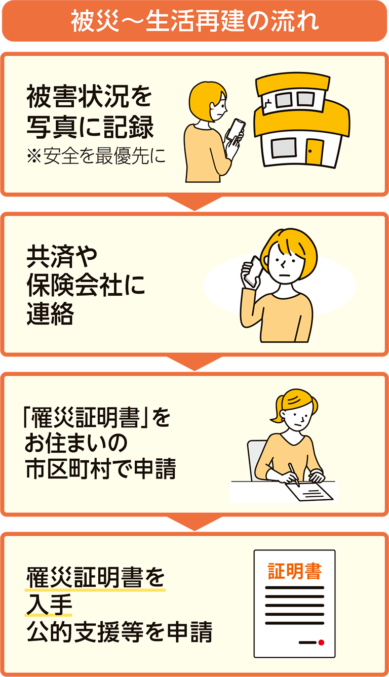 自然災害に遭遇したとき、個々の力だけで生活を立て直すことは困難です。再建のためにはどうすれば良いのか?被災後から生活再建までの流れ、そしてどのような支援があるのかを紹介します。