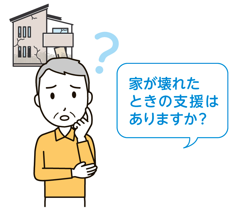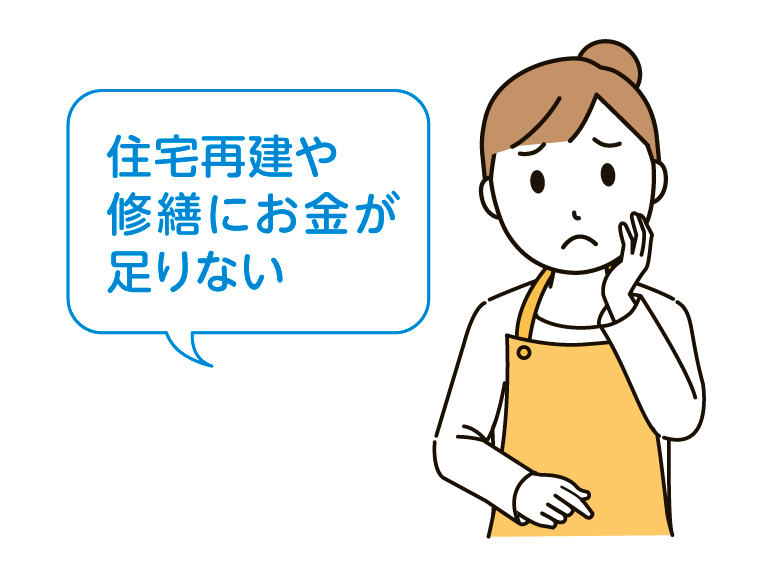 固定低利の融資。住宅建設・購入・補修が対象で、準半壊・一部損壊は補修にのみ利用可能です。60歳以上の場合は、新居や今ある土地を担保に融資を受け、毎月利息のみを支払う「高齢者返済特例(災害リバースモーゲージ)」があります。申し込み前に住宅金融支援機構によるカウンセリングが必要です。(問い合わせ先:住宅金融支援機構お客様コールセンター)