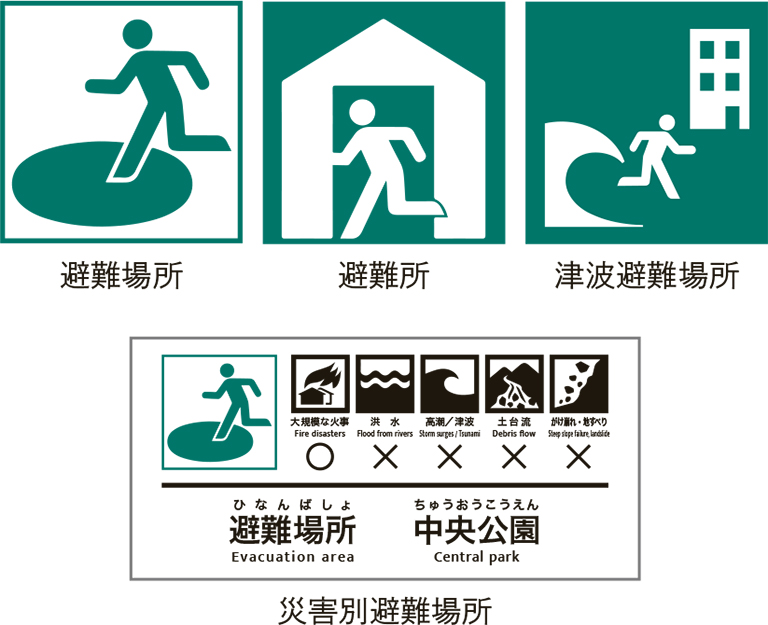 災害の危険から命を守るため、緊急に避難する場所。洪水や崖崩れ、地震、津波、大火など、災害種別ごとに避難する場所が指定されています。