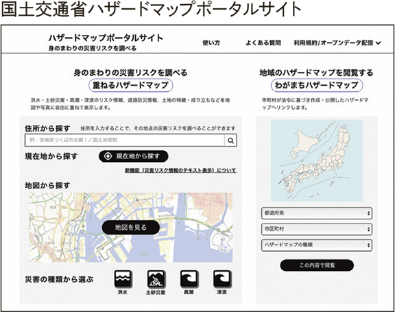 国土交通省が、全国のハザードマップが検索できる「ハザードマップポータルサイト」を公開しています。地域のハザードと火山噴火などを検索できる「わがまちハザードマップ」と、洪水、土砂災害、津波などの複数災害を合わせた「重ねるハザードマップ」がありますので、事前に確認しておきましょう。