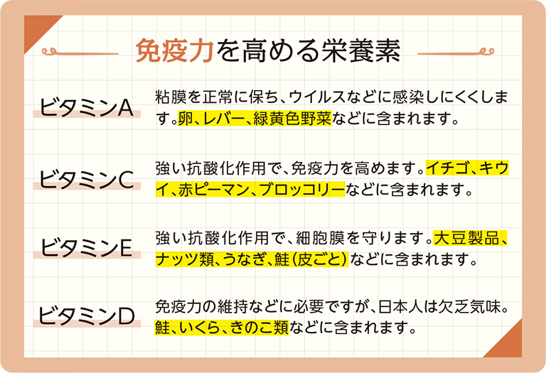 免疫力を高めるには、のどや鼻、消化器官などの粘膜にある免疫細胞の働きを保つ「ビタミンA」、抗酸化作用が強力な「ビタミンCやE」、粘膜で免疫の攻撃や防御を統制する「ビタミンD」が重要です。これらが不足すると、感染症にかかるリスクが高まります。ビタミンDは、紫外線を浴びると皮膚で活性化されますが、日光を浴びる機会の少ない現代人は欠乏しやすいので、食事から積極的に摂取する必要があります。また、亜鉛は、抗酸化物質の活性作用があり、細胞にダメージを与える活性酸素を除去してくれます。