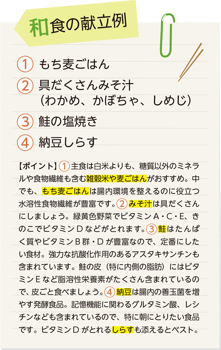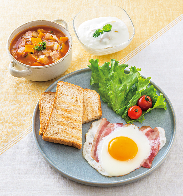 下で紹介する「理想的な朝ごはんの例」のように、卵や鮭などの主菜と、いろいろな野菜を入れた汁物を組み合わせて、「わが家の定番メニュー」を決めておくと、メニューに悩まなくていいのでおすすめです。