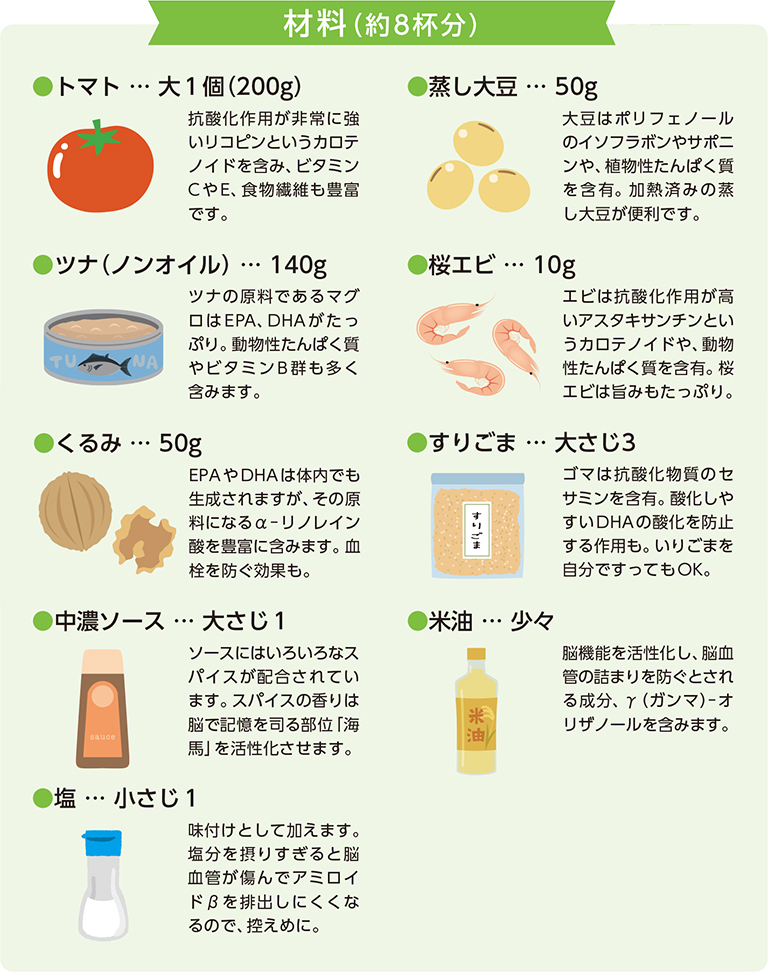 しかし現実的には、こうした多種多様な栄養素をバランス良く含んだ食事を毎日作るのは大変です。おすすめは、脳に良い栄養をしっかり摂れる「脳のおそうじスープ」。毎日の食事に取り入れるだけで、アミロイドβの排出を促し、活性酸素の発生を抑制してくれます。料理が苦手な人でも作れるので、ぜひ実践してみましょう。