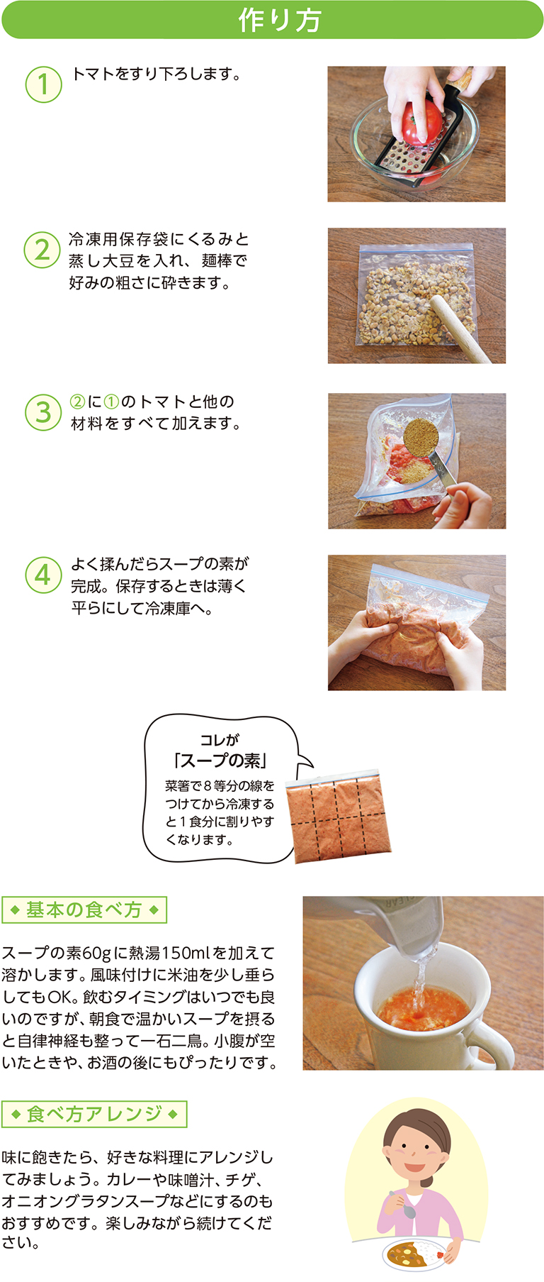 脳のゴミを排除する栄養素をぎゅっと詰め込んだ、内野先生考案のスープをご紹介します。スープの素をまとめて作って冷凍でストックしておき、食べるときに熱湯で溶くだけ。包丁を使わないので調理も簡単です。毎日1杯、できるだけ長く続けてみましょう。数カ月後には記憶力など脳の認知機能が改善されていくはずです。