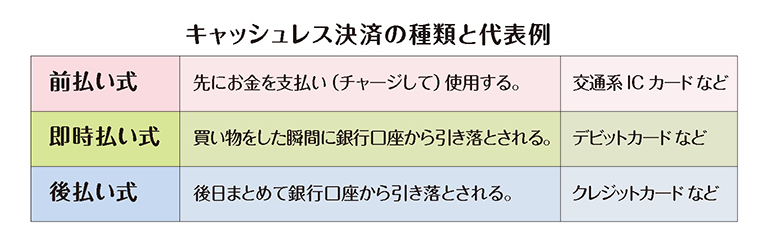 一つ目は「前払い式」。先にお金を支払い(チャージして)、その金額分までの決済ができます。二つ目は「即時払い式」。買い物をした瞬間に指定した銀行口座からお金が支払われます。三つ目が「後払い式」。一定期間に使った分を後でまとめて支払う仕組みです。