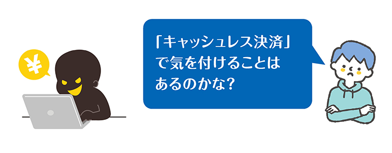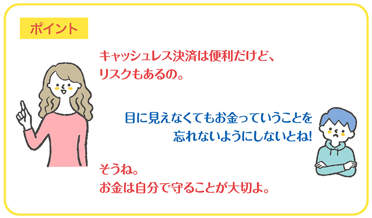 そこから、銀行口座や残金、使用履歴などの多くの情報を読み取ることができます。そんな便利なキャッシュレス決済ですが、リスクもあります。重要な点は、現金ではなく「情報」でやり取りするということ。何らかの方法で、その情報が盗まれてしまえば、悪用されることもあります。また、現金に比べて支払った感覚が薄くなり、つい支払える限度以上に買い物をしてしまうことも。目には見えなくても、大切なお金の一つであることを忘れないようにしましょう。