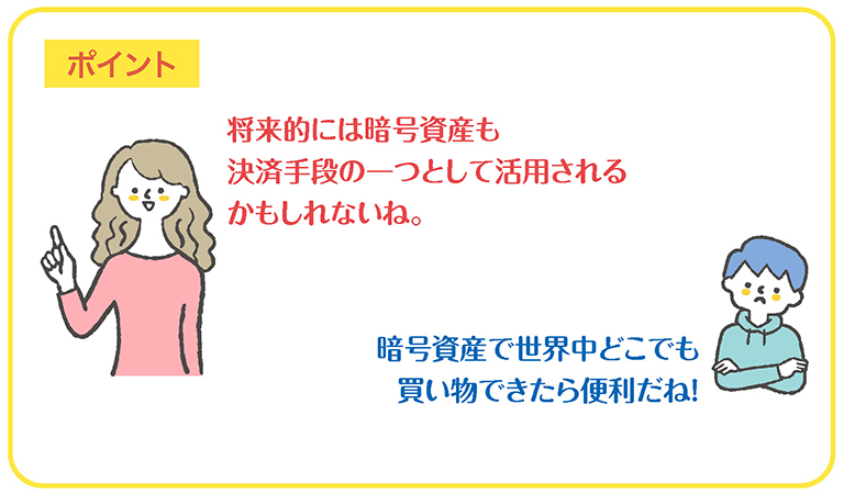 通常外国と取引をする場合、円やドルなどどちらかの国のお金に変換しなければなりませんが、暗号資産は世界中どこでも「同じ価値」として取引できるため、その手間や手数料が掛かりません。しかも、「ブロックチェーン」という仕組みで、みんなでお金の動きをチェックしているから、誰かが勝手に盗む(データを改ざんする)ことはできないようになっています。また、住んでいる国の経済状況が暗号資産の価値に影響することがないことから注目されています。