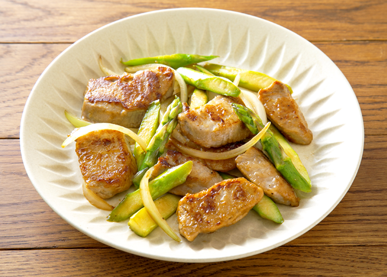 2~3分経って裏返したら玉ねぎ、アスパラガスも加えてさらに炒める。