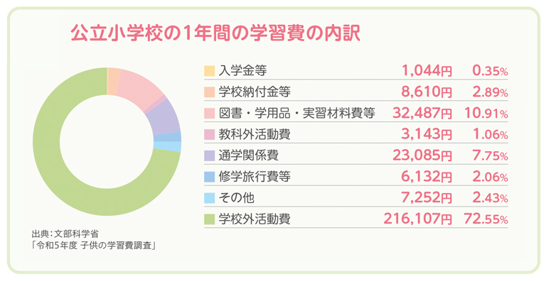 さらに貯めやすくするためには、親の意向で習い事を増やしすぎないことも大切です。公立小学校に通う子どもの学習費の内訳をみると、その7割は習い事などの学校外活動費です。多すぎると家計のみならず子どもにも負担がかかることもあるので、子どもの意向をふまえ優先順位をつけましょう。
