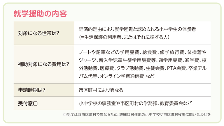 小中学校の子どもがいる世帯で、経済的な理由から学用品や給食費、修学旅行費などの負担が難しいときは、「就学援助」による支援を受けられます。生活保護受給世帯、それに準ずる世帯が対象です。援助される費目や申請時期は各市区町村で異なり、新入学前に必要な費用を支給する自治体もあります。親の失業など家計急変時も利用できます。困ったときは学校や居住地の教育委員会に問い合わせましょう。