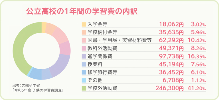 高校では、中学校までは不要だった授業料や教科書代等がかかるようになります。ただし就学支援金制度による授業料支援があり、地域を問わず支援を受けられます。