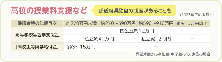 なお、保護者の傷病や失業などで家計が急変したときは、授業料支援を受けられるしくみもあります。困ったときは学校に相談しましょう。