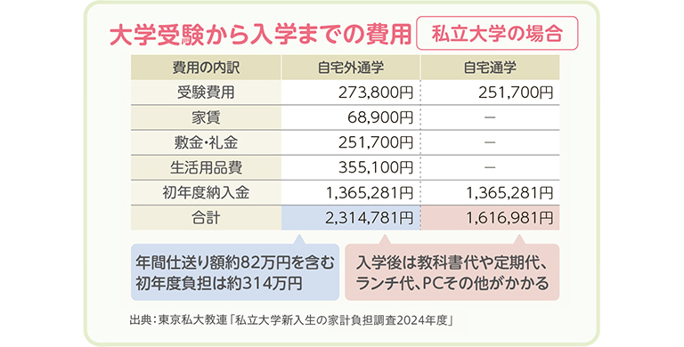 「私立大学新入生の家計負担調査」によれば、受験から入学時までの必要費用は、自宅生161万円、下宿生314万円となっています。