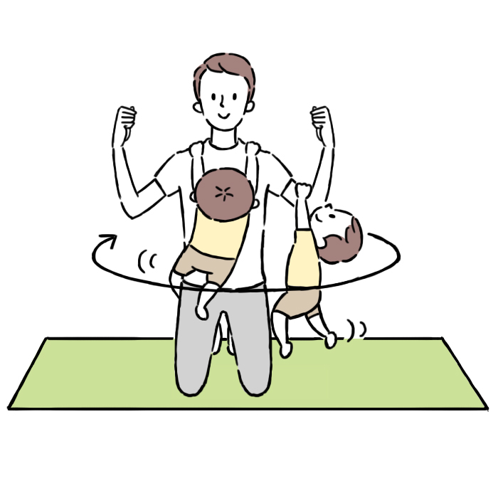 子どもは体を思ったように動かす訓練や、ぶら下がるための筋力、落ちないためのバランス感覚を鍛えることができる運動遊びです。大人は同じ姿勢を保つことで、全身の筋力を鍛えることができます。できればお父さんお母さんが一緒に居るときに行い、子どもがバランスを崩したときには体を支えてあげるようにしましょう。