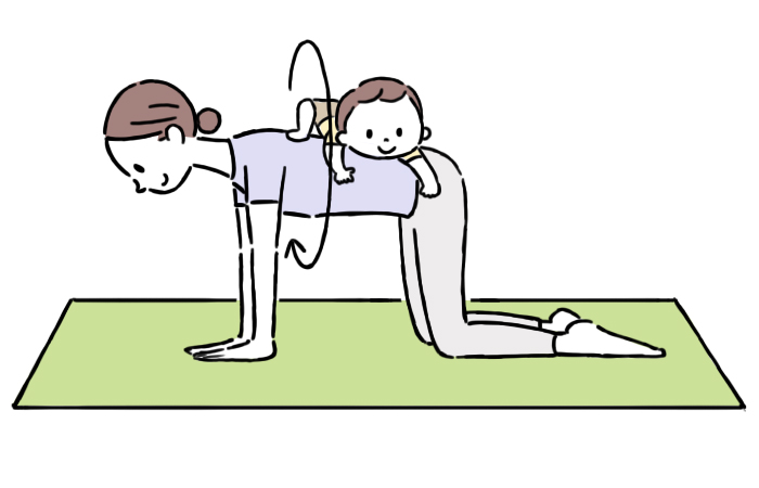両手と両膝を着いて四つん這いの姿勢になって行うのも効果あり。この姿勢を子どもが乗り越える「ジャングルジム」もおすすめです。元気な子どもの場合は、大人がもう1人支えてあげましょう。