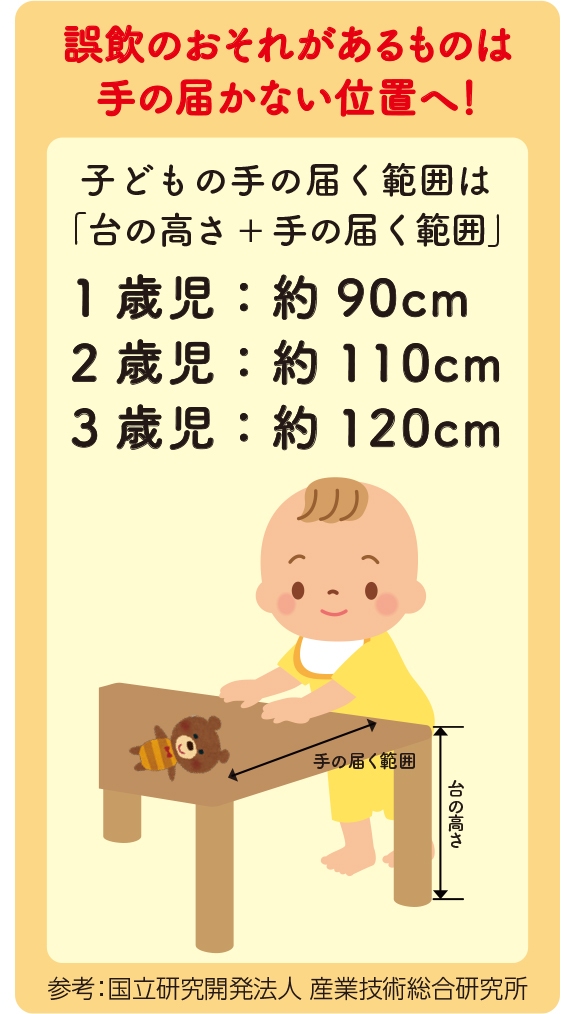 誤飲の危険のあるものは、子どもの手の届かない1メートル以上の高さのところか、カギのかかる引き出しなどに保管しましょう。また、口に入らない大きなものは見落としがちですが、リモコンの蓋を開けてボタン電池を飲み込んでしまうケースなどもあります。蓋をテープで留めるなど、子どもが開けてしまわない工夫が必要です。薬やサプリも、家族が飲んでいる様子を見ると真似したがるので、子どもが見ているところでは飲まないようにしましょう。