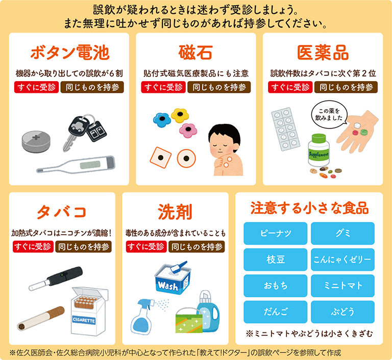 万一飲み込んでしまった場合は、医師に「何を飲んだか」を正確に伝えることが重要です。電池が入っていたケースや誤飲したものと同じ薬など、情報になりそうなものはなんでも持参してください。また、誤飲の4割は現場を目撃されていません。その場にあるはずのものがなくなっているときは、確証が持てなくても病院へ。もし飲んでいなくても病院に迷惑をかけることはないので、慎重になるに越したことはありません。