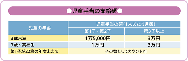 児童手当の金額は右表のとおり。3歳未満の子どもがいる場合、月額1万5,000円、3歳から高校生までは1万円、第3子以上の場合は全年齢で3万円が受け取れます。22歳の年度末までの子どもは支給対象ではありませんが、子どもの数としてカウントできるため、第1子が高校を卒業したのちも第3子が3万円を受け取ることが可能です。