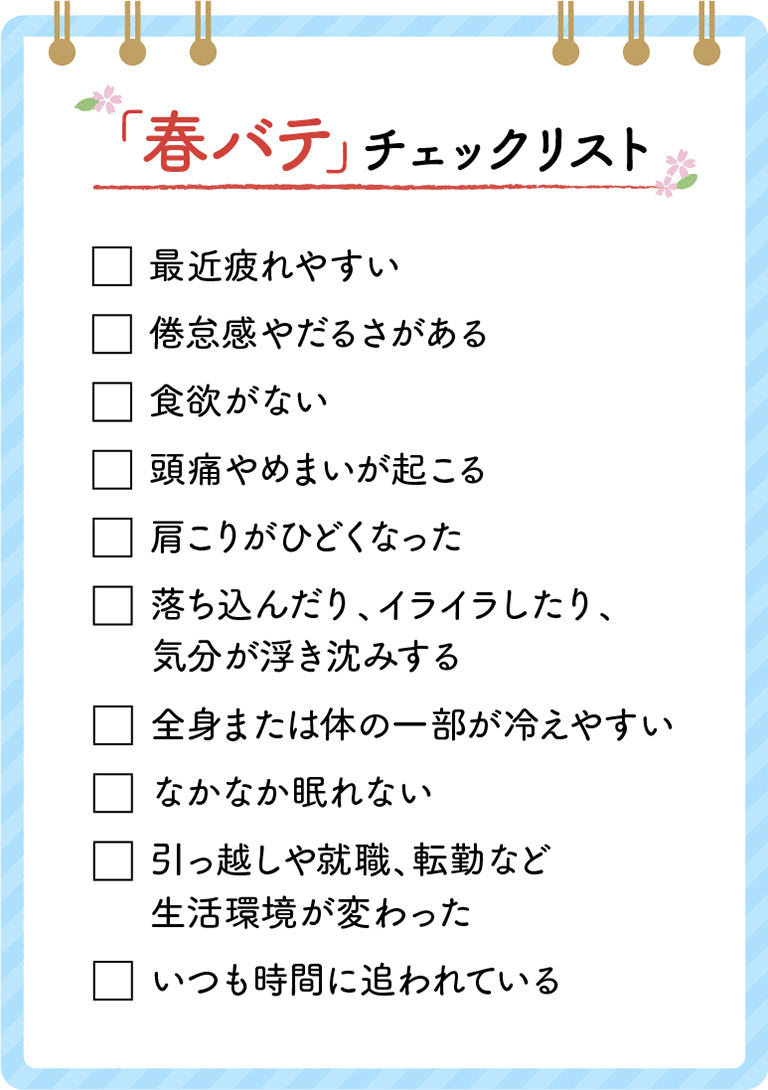 次の項目に当てはまるものがないか、セルフチェックをしてみましょう。3個以上当てはまる場合、「春バテ」の可能性があります。