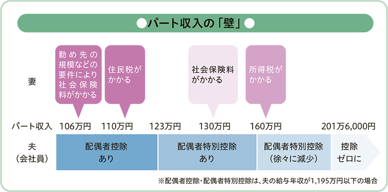 税金については、年収が110万円を超えると住民税(所得割)がかかり(級地区分により均等割がかかる場合あり)、160万円を超えると所得税がかかるようになります。また、夫の税金計算の際に用いられる「配偶者控除」は、妻の年収が123万円を超えると適用外になります。160万円までは「配偶者特別控除」を適用できますが、160万円以降は段階的に控除額が減っていき、201万6,000円以上でゼロになります(夫の給与年収が1,195万円を超えるといずれの控除も対象外、満額38万円を受けられるのは給与年収1,095万円以下の場合)。
