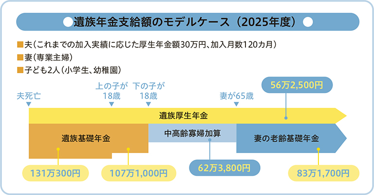 40歳以上の子どものいない妻(子どもが18歳の年度末に達し遺族基礎年金がなくなった妻も)には、再婚しないかぎり、65歳まで「中高齢寡婦加算」が合わせて受け取れます。