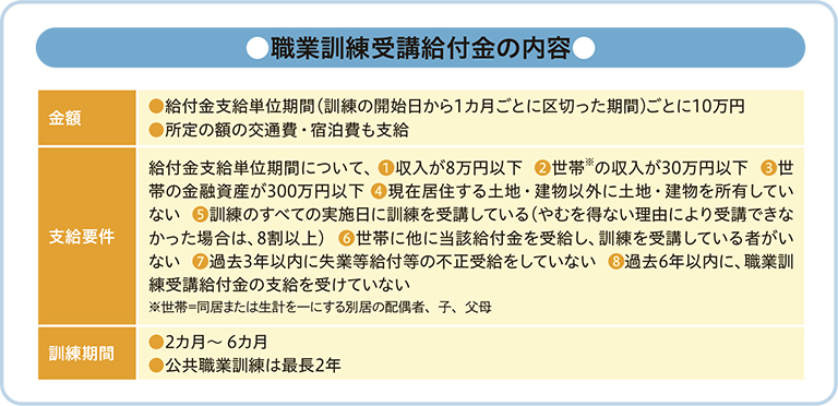 雇用保険に加入できなかった、自営業を廃業したなどの雇用保険を受給できない「特定求職者」には、「求職者支援制度」があります。スキルアップをとおして早期の就職を目指すための「求職者支援訓練」を原則無料で受講できます(テキスト代などは自己負担)。住所地を管轄するハローワークに問い合わせましょう。また、要件を満たせば、「職業訓練受講給付金」の給付が受けられます。