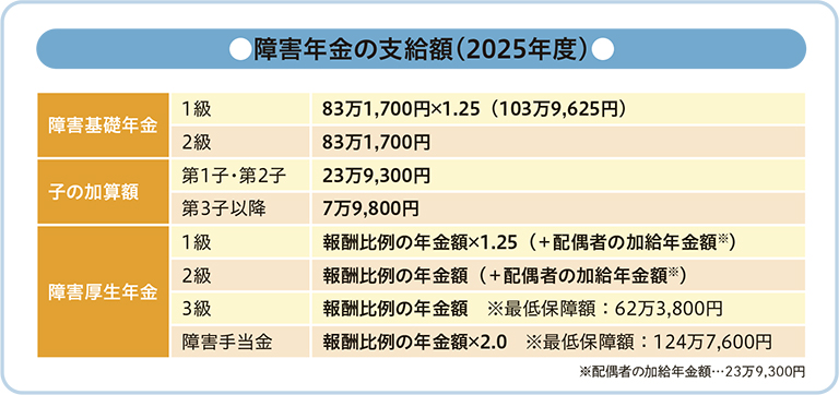 年金額は年度ごとに改定されますが、2025年度は表のとおり。たとえば、障害等級1級の状態となった人に加算対象となる子どもが2人いる場合、103万9,625円に子の加算額23万9,300円×2がプラスされます。