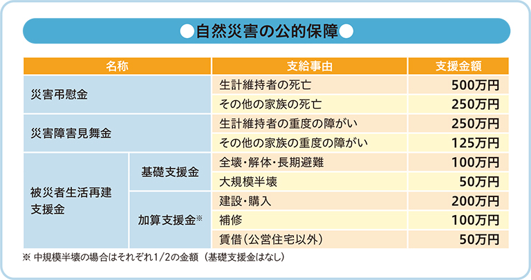 1市町村で10世帯以上の住宅全壊被害が発生するなどの場合は、「被災者生活再建支援制度」の対象となります。とはいえ、受け取れるのは最大で300万円。私的財産を守るのは自己責任の範疇で、公的な支援は手厚くありません。生活を再建するには、民間の火災保険や地震保険で備える必要がありそうです。